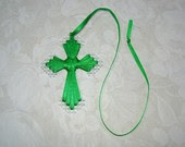 To make the change to necklaces, I had to snip the ribbon about a 1/4" from the top of the cross. When I was using simple Offray Spool O'Ribbon 1/8" satin ribbon, simple glue-dots were great for tacking down the tab at the top before attaching the "necklace." I ended up making the necklace for over the head with clear plastic lacing which comes on 100' spools. I cut 36" of lacing, threaded it through the outside holes on the 2nd row from the top, wove it through once again, and tied two knots at the top with about 3/4" of each end of the strand free. I pulled the top strands tight, pulled the knots up tight, then pulled apart the lacing below the knots to make it tight.