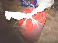 Anyhow, between us, we talked about my can cozies and about one gal's "plarn" projects. Plarn stands for "plastic yarn." I've mentioned that, before, too, and included a site for some plarn patterns and free instructions. This gal is the first one I've known locally who has finished some projects with it. I really do have to start cutting and splicing my collection of grocery bags. I saved some bags, too, that were especially pretty, color-trim-wise. A family friend had to use those adult incontinence products and the bags are similar to those for tot's diapers. I've got a ton of those bags and I can picture what a tote, made from them, would look like.